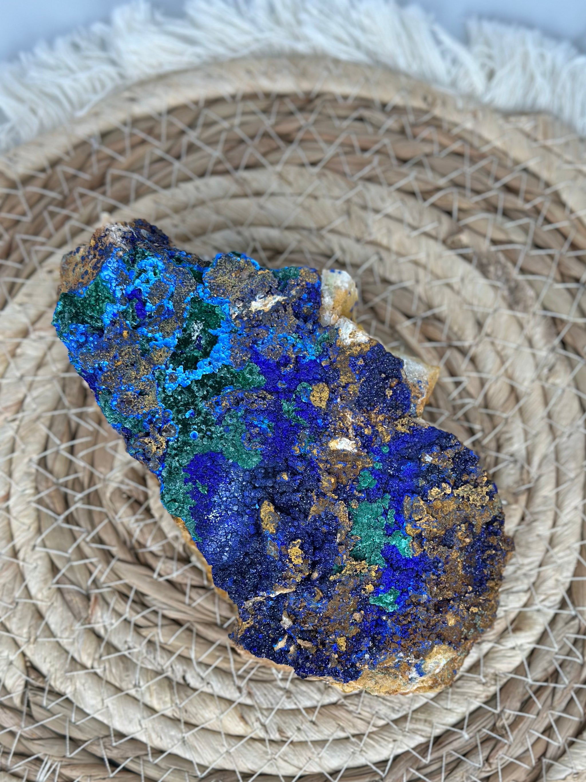 Azuriet met malachiet is een krachtige combinatie die hoofd en hart in balans brengt. Het diepblauwe azuriet opent het derde oog en bevordert intuïtie en spiritueel inzicht, terwijl het groene malachiet helpt bij emotionele heling en persoonlijke groei. Samen ondersteunen ze bewustwording, transformatie en bescherming tegen negatieve energie.