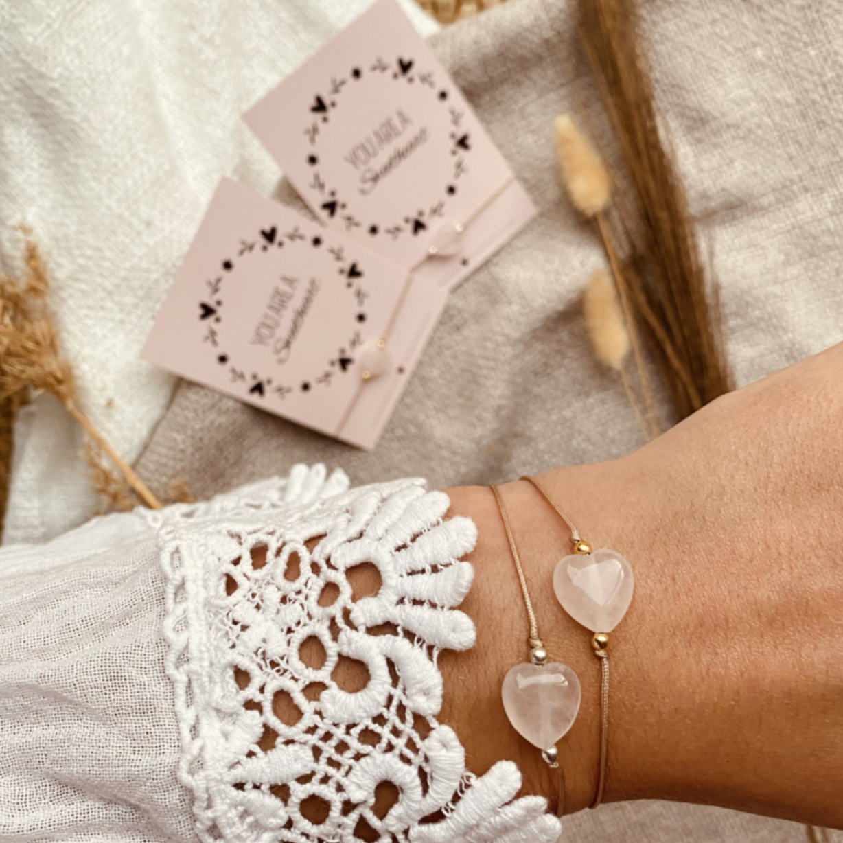 De armbanden zijn verstelbaar met een subtiel schuifknoopje.